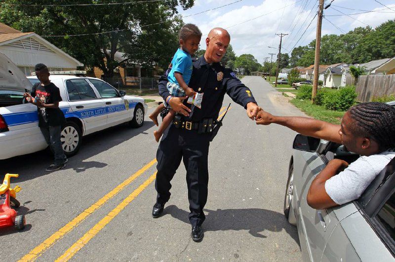 Police Officer Tommy Norman gets a fist bump from Roderick McClinton as he hands out water, snacks and toys to children at 16th and Sycamore streets while on patrol in July 2016 in downtown North Little Rock. (Arkansas Democrat-Gazette)
