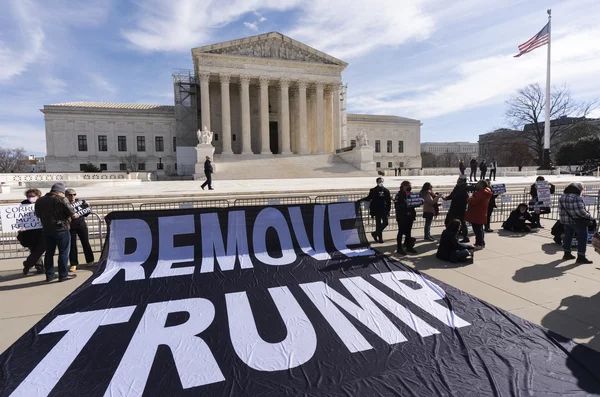 A banner is displayed in front of the U.S. Supreme Court on Thursday as justices prepared to hear arguments in a case about whether former President Donald Trump can be disqualified from state ballots. The case has profound implications for the 2024 presidential election.