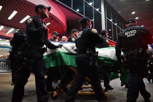 Members of the NYPD and the family of Officer Jonathan Diller are pictured during the dignified transfer of his body at Jamaica Hospital in Queens on Monday, March 25, 2024. NYPD Officer Jonathan Diller was fatally shot while conducting a vehicle stop on Mott Ave. in Far Rockaway. (Photo by Kyle Mazza / SOPA Images / Sipa USA via AP Images)