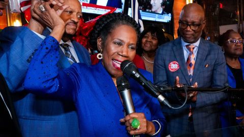 “Sheila Jackson Lee, with her husband, Elwyn Lee, left, and Bishop James Dixon, right, speaks to supporters during her election night watch party on March 5, 2024, in Houston.”